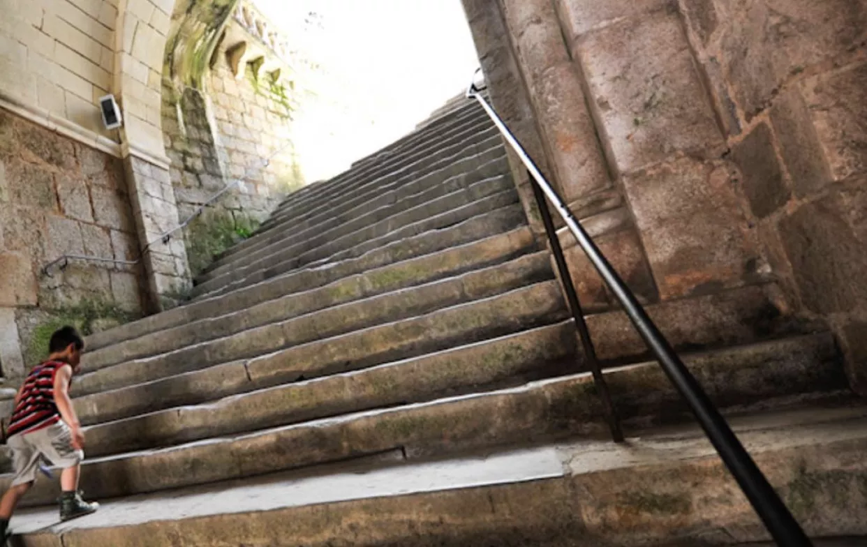 [IMAGE: A modern pilgrim with walking stick and scallop shell badge climbing the Grand Escalier, showing the continuation of centuries-old pilgrimage traditions]